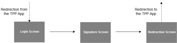 To carry out its strong authentication on the ASPSP side, the PSU will be redirected from the TPP APP through several pages within the workflow described below.