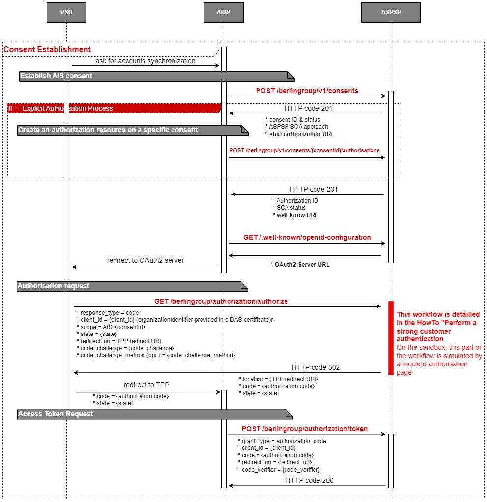 To access all AIS API, a valid consent established between the TPP, the PSU and the ASPSP is required. In addition, when TPP are using the REDIRECT workflow, they must also provide the access token related to the given consent. The APIs accessible with this consent are listed below. All specifications of these APIs can be found on the API page of this developer portal.